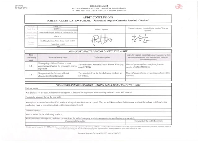 經(jīng)一系列嚴(yán)苛的文件資料審核、現(xiàn)場(chǎng)確認(rèn)等程序,棟方股份順利通過(guò)檢查組一致確認(rèn),繼續(xù)保持“歐盟ECOCERT天然有機(jī)化妝品生產(chǎn)認(rèn)證”榮譽(yù)資質(zhì)。