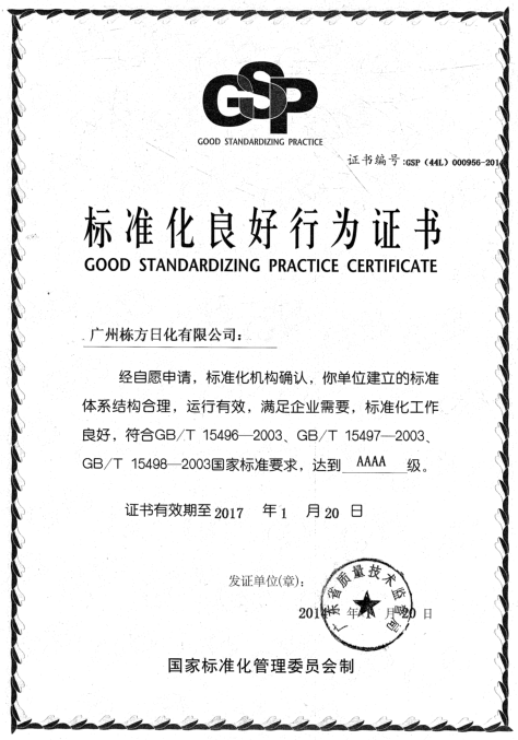 2017年4月20日,廣州市質量監(jiān)督檢測研究院與標準化研究院組織6人評審組,對廣州棟方生物科技股份有限公司進行了“標準化良好行為企業(yè)”首次復審。經一系列嚴苛的資料審核、現(xiàn)場確認等程序,棟方股份以總計465的高分(總分500)優(yōu)勢,順利通過專家評審組的一致確認,繼續(xù)保持“國家AAAA級標準化良好行為企業(yè)”的榮譽稱號。